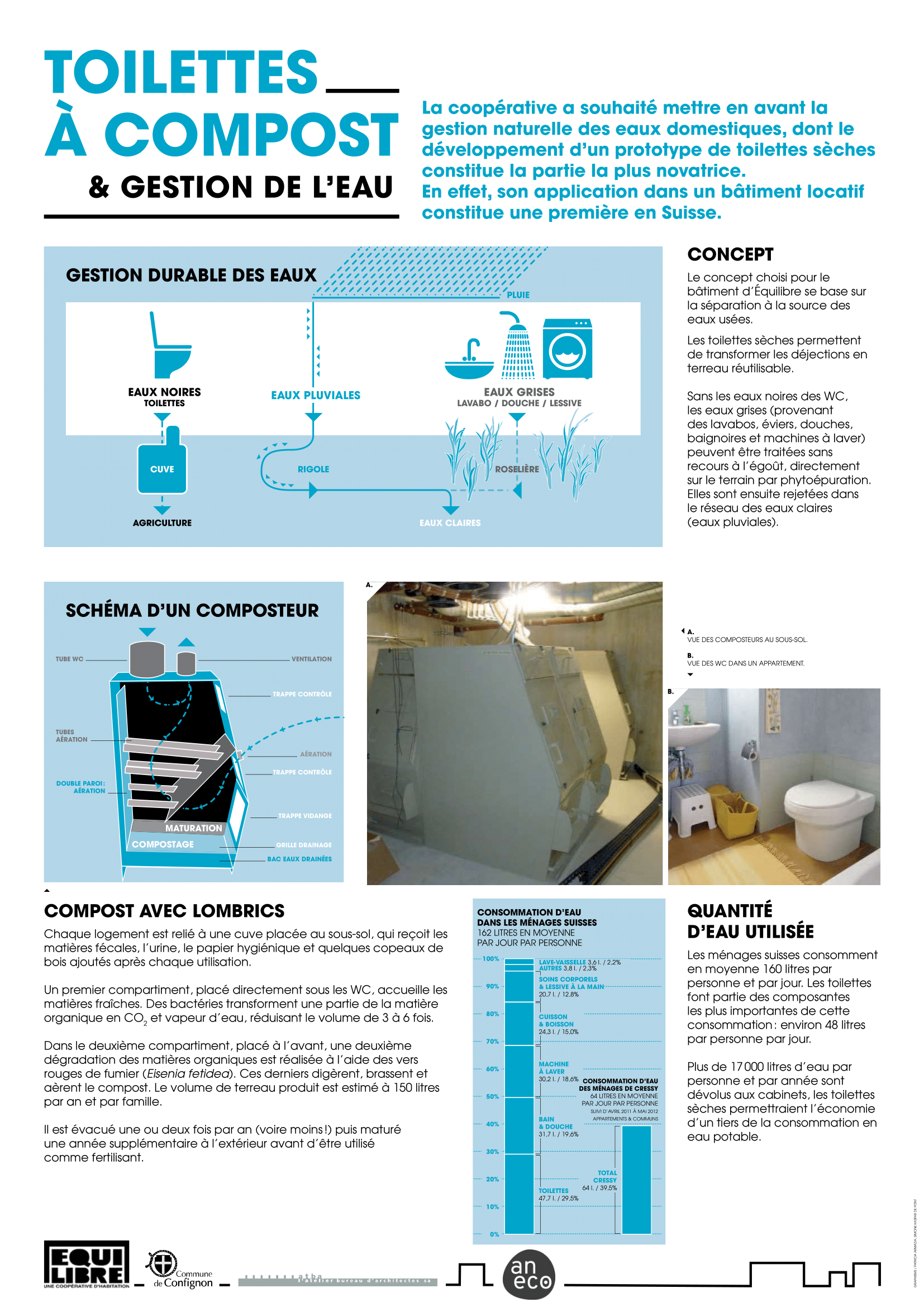 Chaque appartement est équipé de toilettes sèches à séparation d’urine. Les matières fécales sont traitées en sous-sol dans des composteurs dédiés à chaque appartement et les urines sont transformées en engrais avec le système Pitribon (nitrification dans des filtres aérés sur charbon végétal). Les eaux grises sont traitées dans un filtre planté situé dans le jardin.
