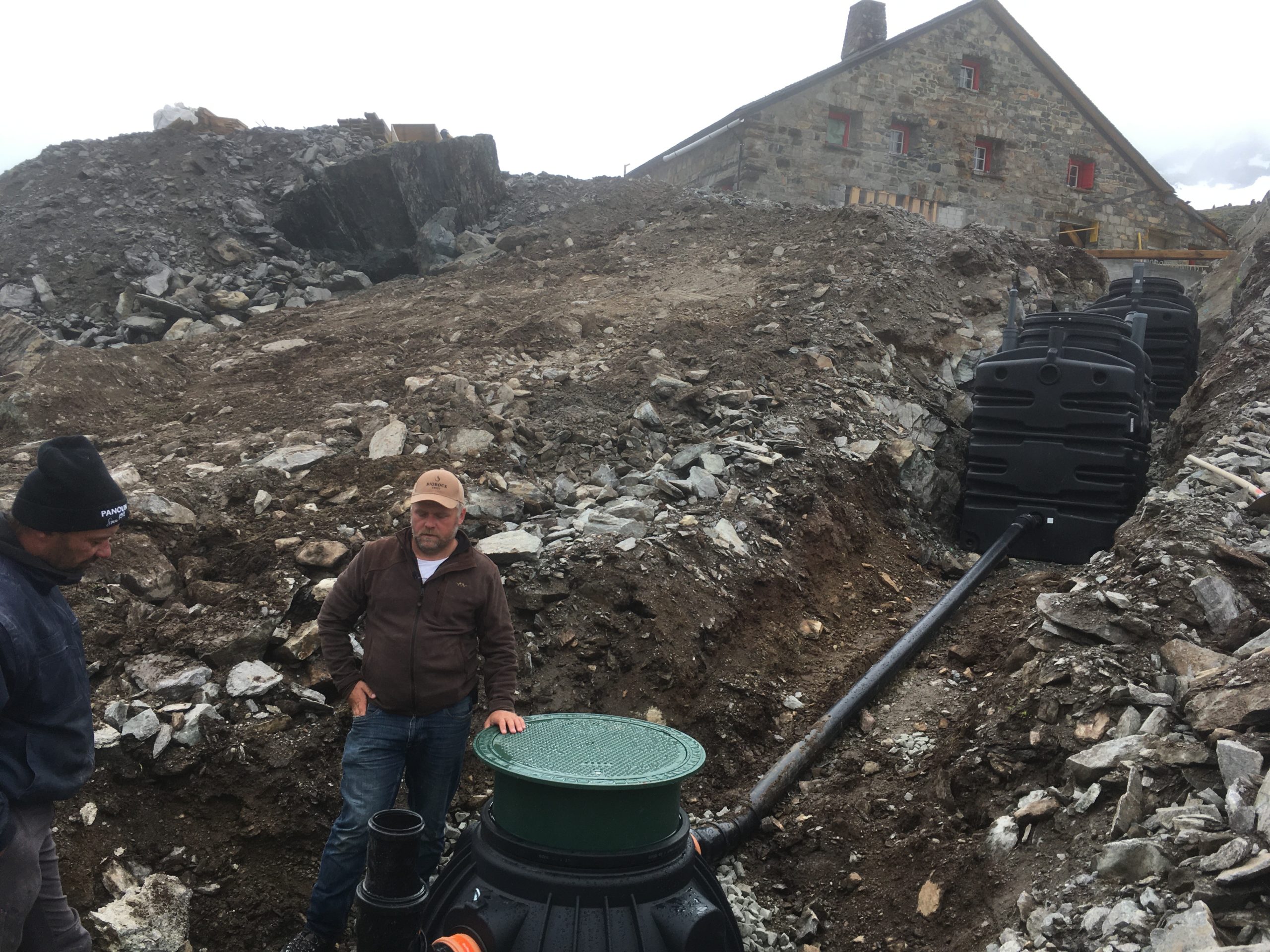 Auf so manchen Maiensässen und Berghütten werden die Abwasser unzureichend aufbereitet in die Natur entlassen. Vuna GmbH plant und baut u.a. alternative Lösungsansätze im Berggebieten. Beim Umbau der Grialetschhütte (SAC) wurde ein Trockentoilettensystem mit Urin- & Grauwasserbehandlung und eine Ultrafiltrationsanlage für die Trinkwasseraufbereitung eingebaut. Ein grosszügiger Kompostraum ermöglicht die Lagerung des Fäkalkomposts über mehrere Jahre. Tatsächlich zeigt die Erfahrung, dass auch bei einer Saison mit mehreren tausend Übernachtungen relativ wenig Material anfällt.